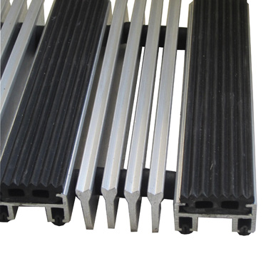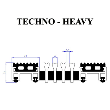 Входное грязезащитное покрытие Techno-Heavy представляет собой решётку из алюминиевого профиля, в котором ворсовые или резиновые вставки чередуются с 4 полосами специального алюминиевого скребка. Зубчатая поверхность скребка позволяет достичь высокой степени очистки подошв обуви.