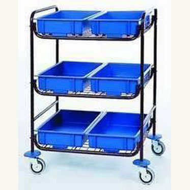 Тележка комплектуется тремя сетчатыми полками (700х500 мм), на которых расположены шесть съемных ударопрочных пластиковых лотка (495х335мм).