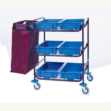 Тележка комплектуется тремя сетчатыми полками (700х500 мм), на которых расположены шесть съемных ударопрочных пластиковых лотка (495х335 мм), одноразовым полиэтиленовым мешком 120 л на откидном держателе (возможна замена на мешок 120 л или 60 л из высокопрочного нейлона).